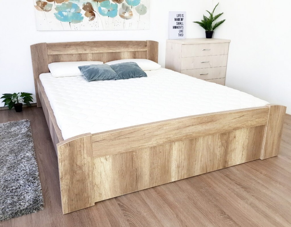 Egyszerű vonalvezetésű, lekerekített sarkokkal, enyhén íves bútorlap ágykeret ágyráccsal együtt.