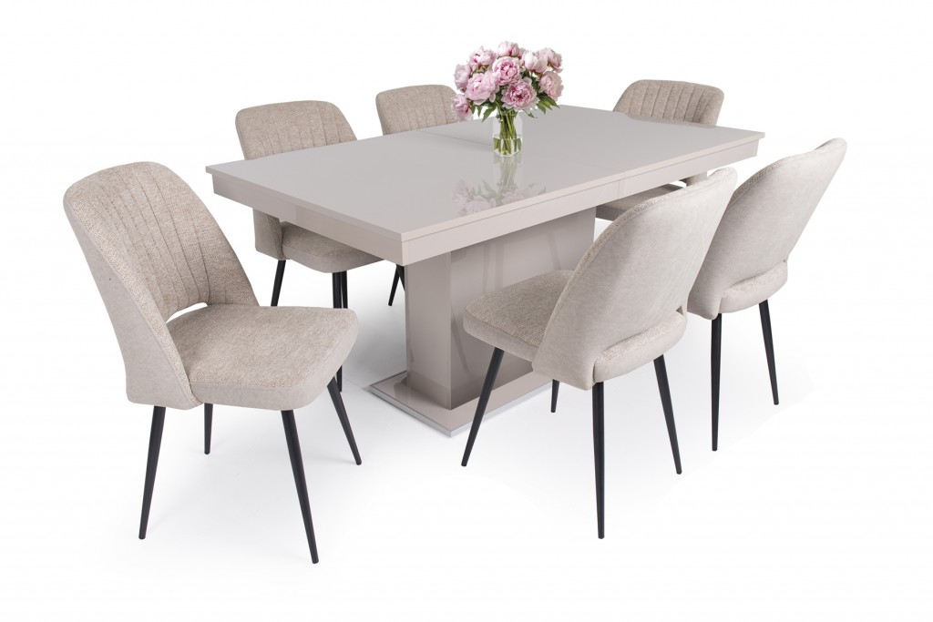 Odett világos barna szék+Flóra magasfényű cappuchino asztal